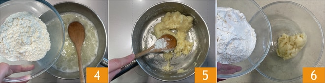 Adicione 75 g de farinha 4 e misture bem no fogo até formar uma película no fundo 5. Nesse ponto, transfira a mistura para uma tigela e adicione os restantes 150 g de farinha em várias vezes 6; você também pode usar uma batedeira com pá.