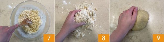 Incorpore gradualmente a farinha, trabalhando a mistura primeiro na tigela com uma colher 7 e depois com as mãos na bancada 8. Quando obtiver uma massa lisa e homogênea 9, envolva-a em filme plástico e deixe descansar na geladeira por cerca de 30 minutos.