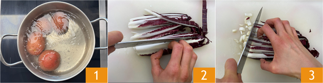 Para preparar as tortinhas de batata espinafre e radicchio, primeiro cozinhe as batatas em água fria salgada por cerca de 30-40 minutos ou até que estejam macias 1. Enquanto isso, prepare o recheio: limpe o radicchio e corte-o primeiro em tiras 2 e depois em pedaços 3.