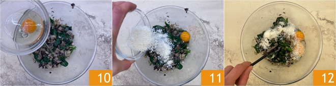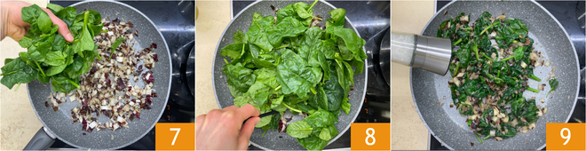 Adicione também os espinafres 7 e cozinhe em fogo médio por cerca de dez minutos. Quando os espinafres murcharem e o radicchio estiver macio, salgue 8 e apimente. Transfira tudo para uma tigela e deixe esfriar, depois adicione os ovos 9.