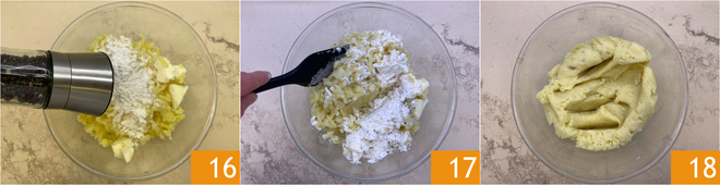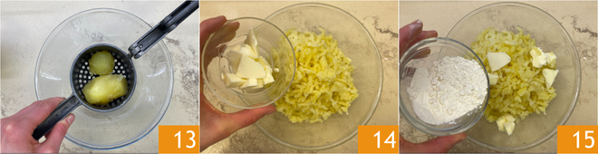Neste ponto, as batatas estarão cozidas, então descasque-as e amasse-as com um espremedor de batatas em uma tigela 13. Adicione a manteiga 14 e a farinha 15.