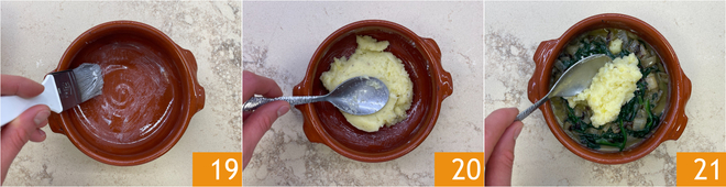 Finalize a composição: unte 4 terrinas 19 e distribua a mistura de batatas na base e nas laterais 20. Despeje o recheio dentro e cubra com mais mistura de batatas, selando bem as bordas 21.