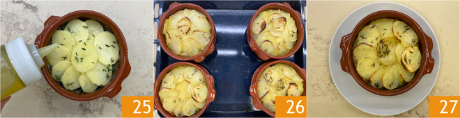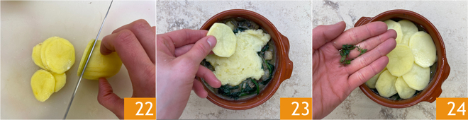 Neste ponto, descasque as batatas para a superfície e corte-as em fatias com espessura de 2 mm 22. Coloque as batatas sobre as tortinhas 23, salgue e perfume com as folhinhas de tomilho 24.