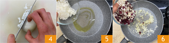 Lave e pique a cebola 4. Coloque a cebola em uma frigideira grande com um fio de azeite quente 5 e frite por alguns minutos. Quando a cebola estiver transparente, adicione o radicchio 6.