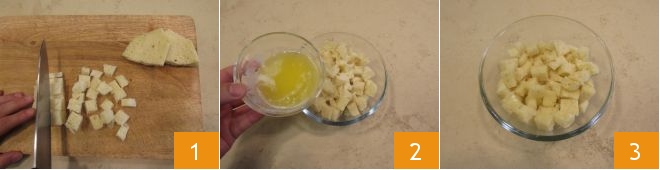 Para preparar as tortinhas de canocchias, comece cortando o pão branco em fatias, elimine a parte da crosta e corte a miolo em cubinhos 1; transfira-o para uma tigela e derrame a manteiga derretida por cima 2. Misture bem e deixe descansar por pelo menos 10 minutos 3.