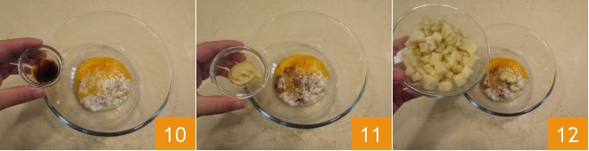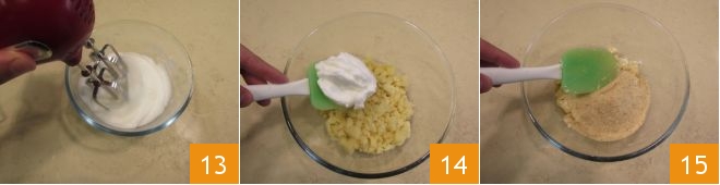 Neste ponto, bata as claras em neve 13 e incorpore-as delicadamente ao restante dos ingredientes com uma espátula 14, em seguida adicione também a farinha de rosca 15.