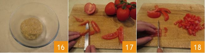 Misture até obter uma massa homogênea 16, cubra com filme plástico e deixe descansar na geladeira. Enquanto isso, dedique-se à preparação do molho. Lave os tomates, corte-os em gomos e elimine a parte interna das sementes 17, depois reduza-os a cubinhos 18.