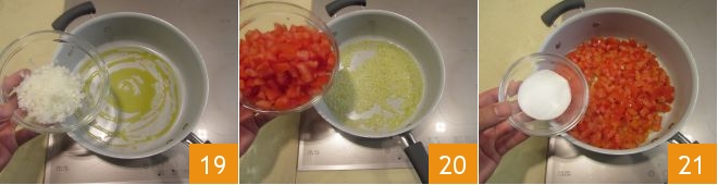 Pique a cebola e transfira-a para uma panela com o óleo 19. Deixe murchar por alguns minutos em fogo médio 20 e adicione também os tomates. Polvilhe com o açúcar e deixe caramelizar por alguns minutos 21.