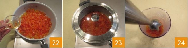 Refresque com o vinagre de arroz 22, cubra com uma tampa 23 e deixe cozinhar por cerca de 25 minutos, mexendo de vez em quando. Transfira tudo para o copo do liquidificador e bata 24,