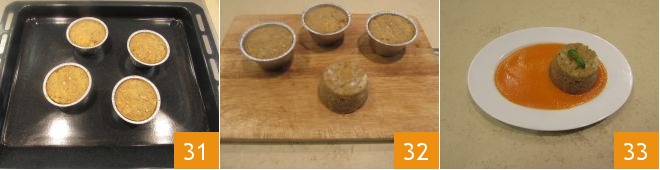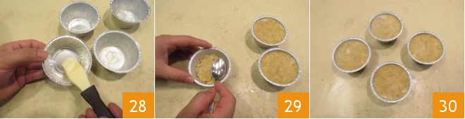 Pegue as formas descartáveis e unte-as com manteiga 28, depois preencha com a mistura de canocchias 29 e nivele a parte superior com a ajuda de uma colher 30.
