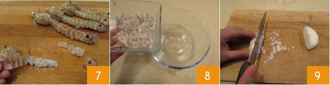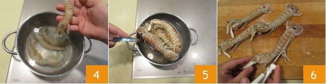 Enquanto isso, ferva as canocchias por 2-3 minutos 4, escorra-as 5, deixe esfriar e proceda à Como limpar as tamarutacas. Corte os apêndices na barriga e aparente depois as laterais 6.