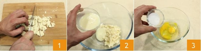 Para preparar os tortinhos de chocolate branco, leite condensado e framboesas, comece picando grosseiramente o chocolate branco 1, coloque-o em uma tigela, adicione o leite condensado 2 e derreta-os no micro-ondas (ou em banho-maria, evitando que a água da panela toque o fundo da tigela onde vai derreter o chocolate e o leite condensado). Em outra tigela, misture os ovos com o açúcar 3;