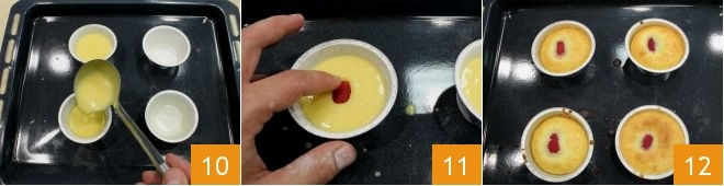 Despeje a mistura até ¾ da forminha 10 e insira uma framboesa no centro 11. Asse os tortinhos em forno estático pré-aquecido a 190°C por cerca de 10 minutos (170°C por 5-6 minutos para forno ventilado, virando a assadeira na metade do tempo de cozimento). Quando estiverem assados, retire-os do forno 12.