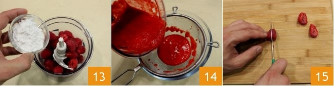Enquanto os tortinhos assam, prepare o coulis de framboesas que irá acompanhá-los: em um liquidificador, coloque as framboesas frescas (reserve algumas para decoração) e o açúcar de confeiteiro 13; bata tudo para obter um purê homogêneo, coe com uma peneira fina 14 para eliminar eventuais sementes ou grumos. Em seguida, corte ao meio as framboesas que reservou inteiras, para a decoração 15