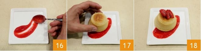 Distribua o coulis espelhado em um prato de servir 16, desenforme os tortinhos de chocolate branco, leite condensado e framboesas e vire-os sobre o coulis 17, decore com as framboesas frescas e sirva!