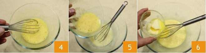 bata-os levemente com um batedor 4 e depois adicione a mistura de chocolate branco derretido já morna 5 junto com a manteiga derretida também morna 6.