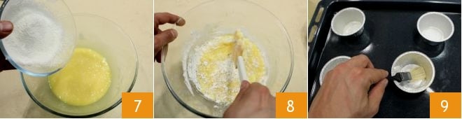 Em seguida, peneire a farinha e o amido de milho e adicione-os à mistura obtida (7-8). Unte e enfarinhe 4 forminhas de alumínio descartáveis 9.
