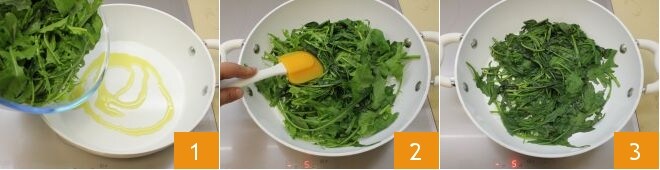 Para preparar as tortinhas de enkir com batatas e chicória, comece fazendo a massa brisè com a farinha de enkir e a chicória selvagem. Primeiro, cozinhe a chicória selvagem em uma frigideira com um fio de azeite 1, por alguns minutos, mexendo de vez em quando 2, até que murche, mas não esteja totalmente seca 3. Em seguida, deixe esfriar completamente.