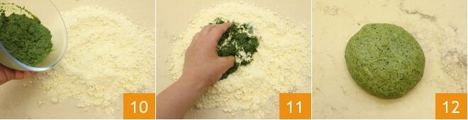 Então, coloque o composto arenoso em uma superfície e adicione o creme de chicória 10. Comece a amassar com as mãos 11 até obter uma massa lisa e compacta 12. Envolva em filme plástico e deixe firmar na geladeira por cerca de 30 minutos.
