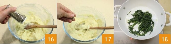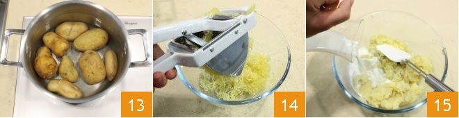 Enquanto isso, comece a preparar o recheio para as tortinhas de enkir. Cozinhe as batatas em abundante água 13, descasque-as e amasse-as ainda quentes dentro de uma tigela 14. Adicione aos poucos o leite, que você aqueceu levemente 15, e misture com uma colher de pau até obter um composto liso.