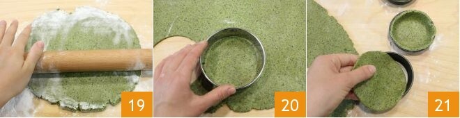 Passados os 30 minutos, você pode esticar a massa brisè até obter uma folha de cerca de 2-3 mm 19. Dela, corte discos com um aro de 11 cm de diâmetro 20. Pegue uma forma de tortinhas (com diâmetro de 8,5 cm) e use os discos recém-cortados para forrá-la 21.