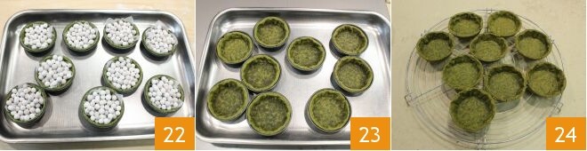 Coloque um quadrado de papel manteiga sobre as tortinhas e cubra-as com esferas de cerâmica adequadas para cozimento às cegas 22. Asse as cascas das tortinhas em forno estático pré-aquecido a 180° por 25 minutos (em forno ventilado a 160° por 15/20 minutos). Após esse tempo, retire as esferas de cerâmica 23 e continue o cozimento por mais dez minutos. Uma vez cozidas, tire as cascas das tortinhas do forno e deixe esfriar sobre uma grelha 24.