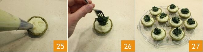 Nesse ponto, tudo está pronto! Resta apenas montar suas tortinhas de enkir com batatas e chicória selvagem. Recheie cada casca com o creme de batatas e funcho, fazendo círculos concêntricos para obter um recheio uniforme 25. Finalmente, com um garfo, pegue um pouco de chicória, como se fossem espaguetes, e posicione no centro da tortinha como se fosse um ninho 26. Finalize as tortinhas com algumas sementes de funcho e sirva 27.