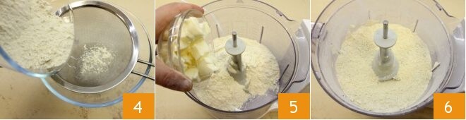 Enquanto isso, peneire a farinha de enkir 4 e coloque-a em um processador junto com a manteiga fria cortada em pedaços 5 e uma pitada de sal. Ligue o processador e deixe formar uma textura de areia, o composto não deve se juntar, mas sim resultar em uma mistura granulosa, como se fosse areia 6.
