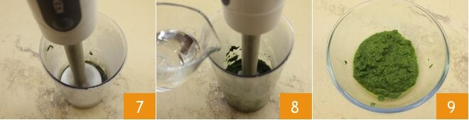 Nesse ponto, bata com um mixer de imersão a chicória selvagem 7, adicionando a água lentamente 8 até obter um creme finíssimo e líquido 9.