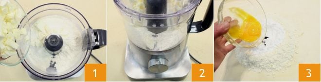 Para preparar as tortinhas de maçã e canela, comece pela massa: no processador de alimentos, coloque a farinha peneirada, o açúcar de confeiteiro e a manteiga fria da geladeira 1. Então, ligue para obter uma mistura arenosa 2, que você deve despejar em uma superfície de trabalho. Faça uma cavidade ao centro e coloque as sementes da fava de baunilha e as gemas 3.