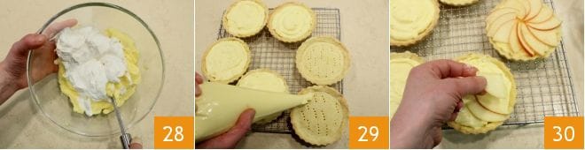 e adicione-o delicadamente ao creme já frio. Misture com uma espátula de cima para baixo 28, depois transfira o creme para um saco de confeitar descartável ao qual você fez uma abertura de cerca de 1 cm. Recheie as tortinhas com o creme 29 e disponha as fatias de maçã bem escorridas em formato de leque 30.