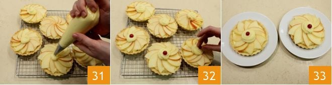 Com o creme restante, faça uma decoração adicional, talvez um pequeno montinho no centro de cada tortinha 31 e decore com uma groselha vermelha 32. As suas tortinhas de maçã e canela estão prontas para serem saboreadas 33!