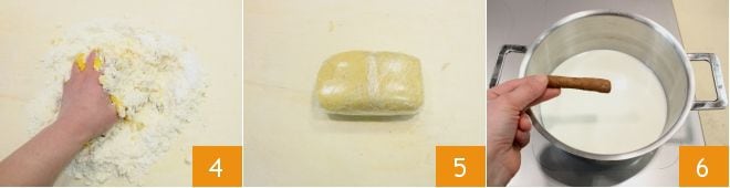 Trabalhe rapidamente a massa 4 e forme um bloco; envolva-o em filme plástico 5 e coloque-o na geladeira por pelo menos 30 minutos. Enquanto isso, dedique-se ao creme: em uma panela, aqueça o leite e 50 ml de creme de leite. Adicione uma pitada de canela em pó e o pau inteiro de canela 6.