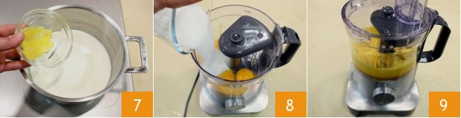 Retire a casca de um limão não tratado e adicione ao leite e creme 7. Enquanto a mistura está no fogo, coloque as gemas no processador de alimentos e adicione o açúcar refinado 8: ligue o processador para misturar os ingredientes 9.