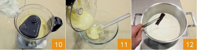 Quando estiverem bem incorporados, adicione o amido de milho 10 e ligue novamente o processador para misturar tudo. Transfira o creme obtido para uma tigela 11. Quando o creme e o leite estiverem quase fervendo, desligue o fogo e remova a casca de limão e o pau de canela 12.