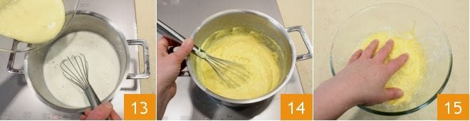 Despeje em fio a mistura com os ovos na panela com leite e creme 13 e mexa com um batedor para evitar a formação de grumos. Ligue o fogo baixo e deixe o creme engrossar. Quando atingir uma consistência cremosa, lisa e sem grumos 14, coloque-o em uma tigela e cubra com filme plástico em contato 15 para esfriar completamente.