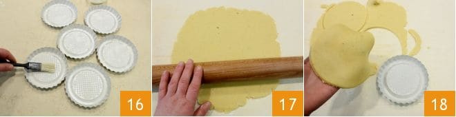 Enquanto isso, unte 16 e enfarinhe cuidadosamente as forminhas para tortinhas de 12 cm de diâmetro. Retire a massa e estenda-a em um disco com espessura de cerca de meio centímetro 17. Com um cortador de 14 cm de diâmetro, corte 6 discos. Posicione cada disco de massa na forminha 18;