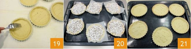 pressione bem contra o molde e, com os dentes de um garfo, faça furos no fundo 19, depois coloque um quadrado de papel manteiga e as esferas de cerâmica para a cozedura às cegas 20 (você também pode usar leguminosas secas como feijões). Asse as tortinhas em forno estático pré-aquecido a 180°C por cerca de 20 minutos (se forno ventilado a 160°C por 10 minutos). Uma vez assadas, retire as bases 21 e deixe esfriar ligeiramente.