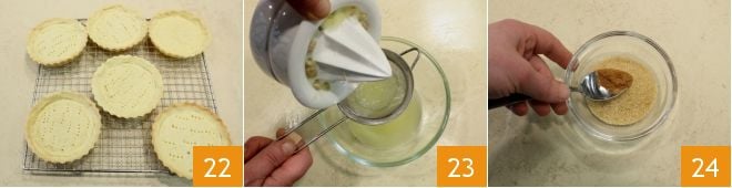 Depois, transfira-as para uma grade para resfriar completamente 22. Em uma tigelinha, coloque o suco do limão espremido e coado 23; à parte, misture o açúcar mascavo e a canela 24 e adicione ao suco de limão.