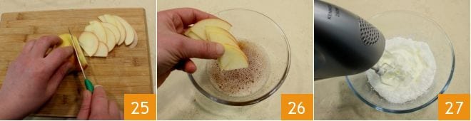 Agora corte as maçãs em fatias finas de alguns milímetros 25 e divida-as ao meio. Mergulhe-as na tigelinha com o limão e o açúcar mascavo 26 para que não escureçam. Em seguida, em uma tigela à parte, bata o creme de leite 27