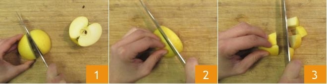 Para preparar as tortinhas de pão guttiau com vinho tinto e maçãs, lave as maçãs e divida-as em gomos 1, sem retirar a casca. Elimine o caule e o miolo e corte os gomos ao meio novamente 2 para depois reduzi-los a cubos de cerca de 1,5 cm 3.