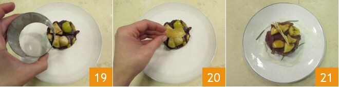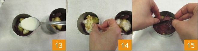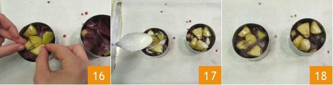 as maçãs 16, o gorgonzola e o pão crocante até obter um total de 3 camadas: finalize com os pedaços de maçã regados com molho de gorgonzola 17. Cozinhe as tortinhas dentro dos aros em forno estático pré-aquecido a 180° por 10 minutos 18.