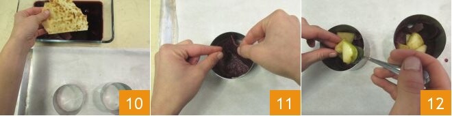 Neste ponto, você pode montar as tortinhas: coloque 4 aros de confeiteiro de 8 cm de diâmetro em uma assadeira forrada com papel manteiga, depois quebre o pão guttiau com as mãos e mergulhe um pedaço de cada vez no vinho tinto para que amoleça 10. Crie uma primeira camada de pão guttiau amolecido dentro dos aros 11, adicione alguns pedaços de maçã 12