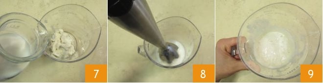 Coloque o gorgonzola em um copo alto e estreito, adicione o leite 7 e bata com um mixer de imersão 8 até obter uma consistência densa e cremosa, semelhante ao bechamel 9.