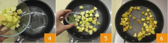 Derreta a manteiga em uma frigideira, adicione as maçãs 4 e o alecrim 5, salgue, coloque pimenta e refogue em fogo alto por cerca de 10 minutos até que fiquem bem douradas 6.