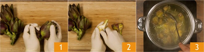 Para realizar a receita das tortinhas de ricota e alcachofras, primeiramente é necessário limpar bem os vegetais: elimine as folhas mais externas 1, em seguida remova as pontas mais duras, corte-as em quartos e elimine a barba no interior 2. Cozinhe as alcachofras em abundante água salgada por cerca de 10 minutos após a fervura 3, elas devem ficar macias.