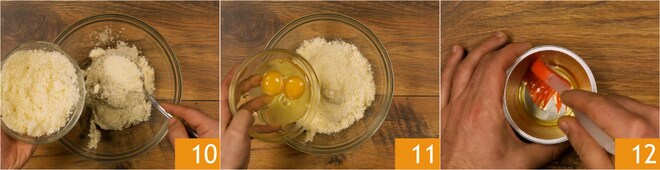 Incorpore 80 g de queijo ralado 10 e os ovos 11, ajuste o sal e a pimenta e misture para amalgamar a massa. Pegue 4 forminhas individuais de cerca de 8 cm de diâmetro, unte com óleo o fundo e a borda 12.