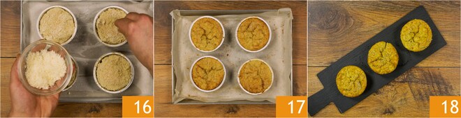 Finalize polvilhando na superfície o queijo restante 16. Asse em forno estático pré-aquecido a 190°C por 30 minutos ou até que fiquem bem douradas. Desenforme as tortinhas de ricota e alcachofras 17 e sirva-as mornas 18.