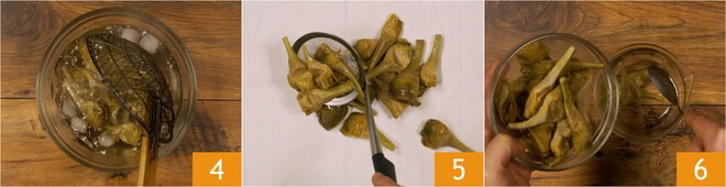 Escorra-as e transfira-as para uma tigela com água fria 4 para interromper o cozimento. Neste ponto, escorra as alcachofras e seque-as com um pano de prato 5, depois coloque-as em um copo alto 6.