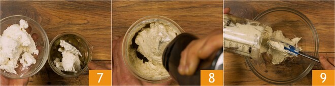 Adicione também a ricota de ovelha 7 e bata tudo com um mixer de imersão 8. Despeje o creme em uma tigela 9.